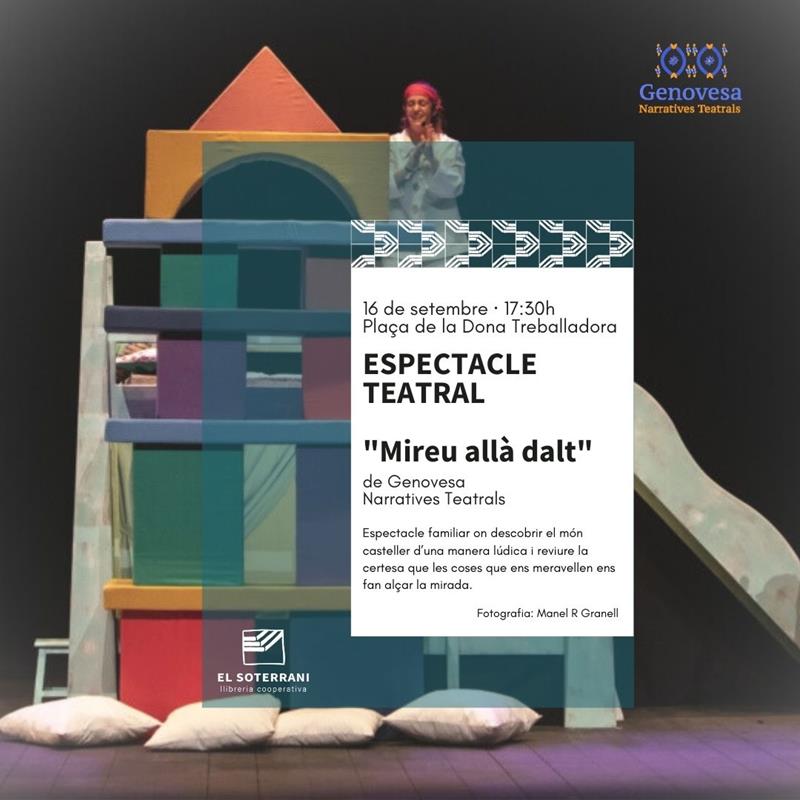 Dilluns, 16 de setembre, a les 17:30, a la Plaça de la Dona Treballadora, Genovesa Narratives Teatrals ens oferirà l'espectacle casteller Mireu Allà Dalt.