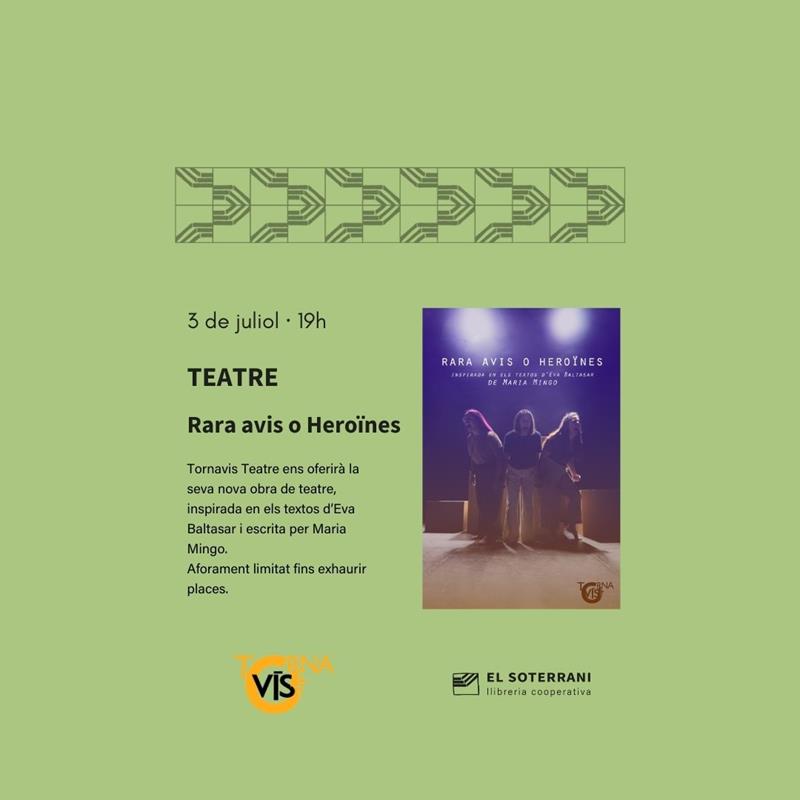 El dimecres, 3 de juliol, a les 19h Tornavís teatre ens oferirà la seva nova obra, Rara avis o heroïnes. Aquesta està inspirada en els textos d'Eva Baltasar i ha estat escrita per Maria Mingo.