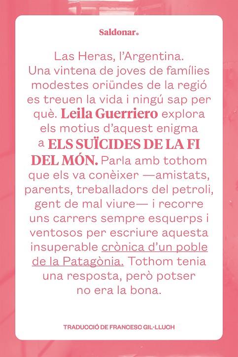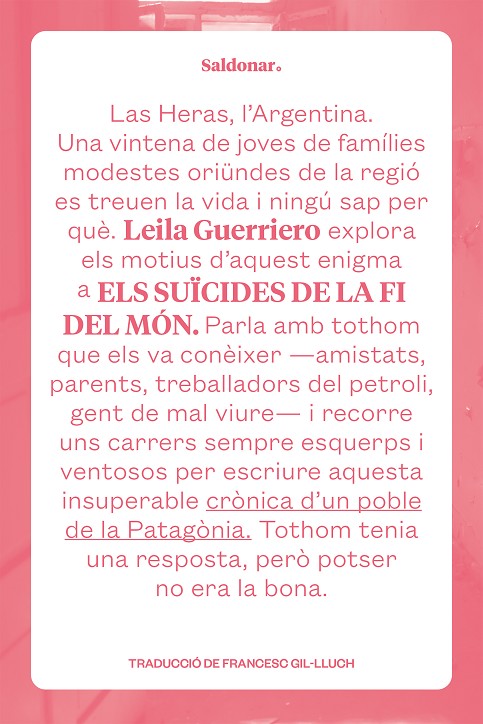 Entre el 1997 i el 1999 una onada de suïcidis sacseja la ciutat petroliera de Las Heras, a la província argentina de Santa Cruz, enmig del no-res. La majoria de les víctimes tenien al voltant de vint-i-cinc anys i havien crescut en famílies modestes de la regió. La periodista Leila Guerriero viatja a aquell indret agrest i salvatge de la Patag.nia, interroga els amics i els familiars dels suïcides, recorre els mateixos carrers que ells, sempre deserts, i visita tots els racons del poble. Entrevista els veïns, fa preguntes a tothom que té una resposta o una teoria que podria explicar un drama tan sorprenent.El resultat de tot plegat és una hist.ria brutal que reconstrueix els episodis tràgics dÆaquells anys i que dibuixa una imatge extrema i inoblidable de la vida quotidiana en una comunitat allunyada de les grans ciutats. Las Heras, amb un alt índex dÆatur pels alts i baixos de la indústria petroliera i per la manca de futur per a la joventut, planteja preguntes difícils de respondre. Els suïcides de la fi del món és un relat inquietant que es pot llegir amb lÆatracció dÆuna novel·la i am